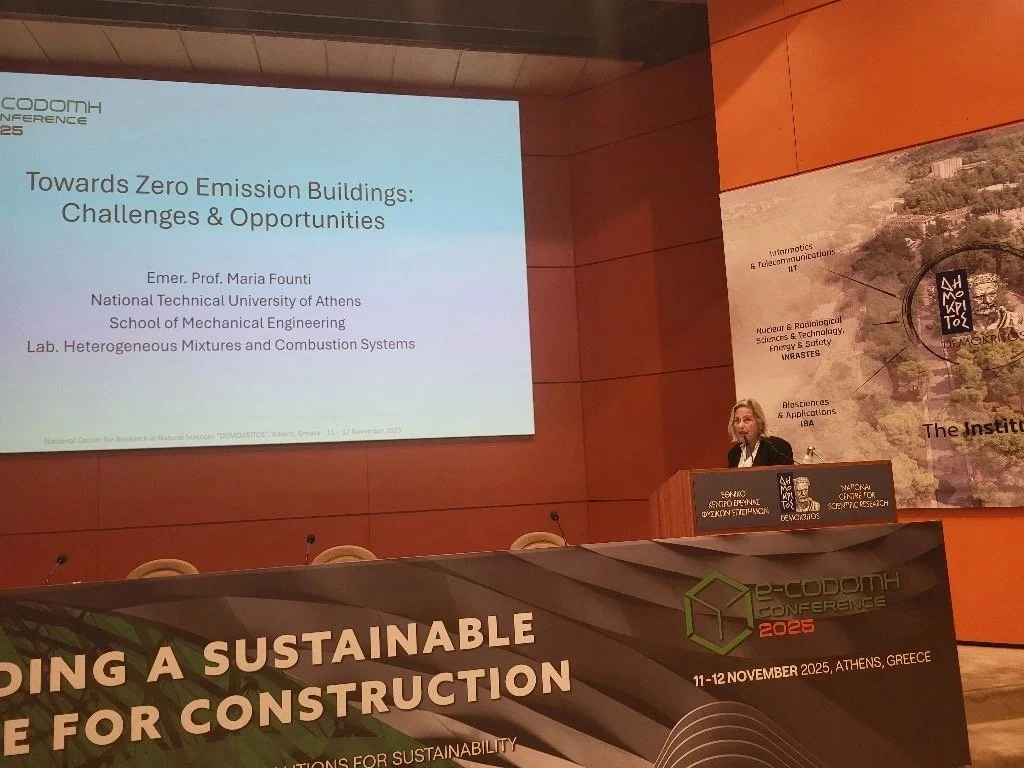 On 12 November 2025, the GreeNest project was represented at the e-CODOMH Conference 2025 in Athens, where project coordinator Prof. Maria Founti from NTUA delivered an invited lecture. Her presentation explored the evolving framework for Zero-Emission Buildings (ZeB) under the revised EPBD 2024, emphasising the shift toward life-cycle-based GWP disclosure, the need for high-performance envelopes, smart controls, on-site renewable systems, and the growing importance of reducing embodied carbon across the building lifecycle.
