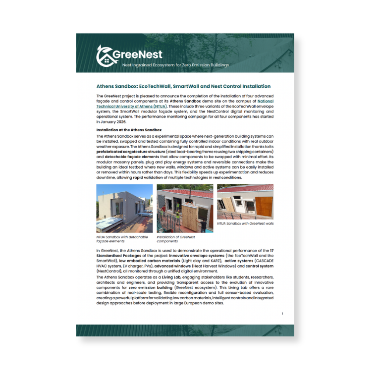 This article presents the installation of innovative façade systems at one of the GreeNest’s demonstration Athens Sandbox, a real-scale testing environment located at the National Technical University of Athens (NTUA). It showcases three variants of the EcoTechWall, including solutions based on light clay bricks, wood fibre, and coffee-based KARZ insulation, alongside the prefabricated SmartWall and the NestControl monitoring system. As part of GreeNest’s Standardised Packages, these systems are being tested under real conditions to evaluate their performance, scalability, and contribution to low-carbon, zero-emission buildings.
